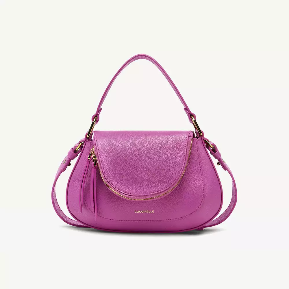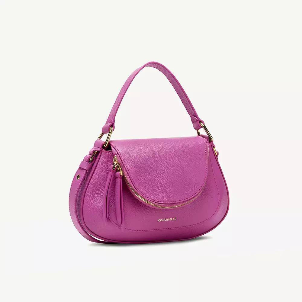 Gli interni delle auto d’epoca e i famosi anni 50 inspirano la linea CoccinelleSole grazie al gioco di tagli e strati di pelle sovrapposti che disegnano una silhouette rotonda, sinonimo di design e attenzione ai particolari. La patta con zip diventa una tasca funzionale, la cui shape ricorda il nostro iconico plettro, così come i raffinati dettagli metallici. Questo modello è realizzato in pelle lavorata tramite specifici macchinari e poi bottalata al fine di mantenerne la morbidezza. È una pelle molto resistente che si presta a una facile pulizia, ideale per un uso quotidiano.