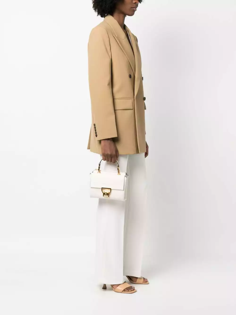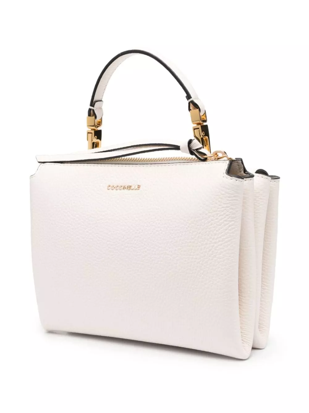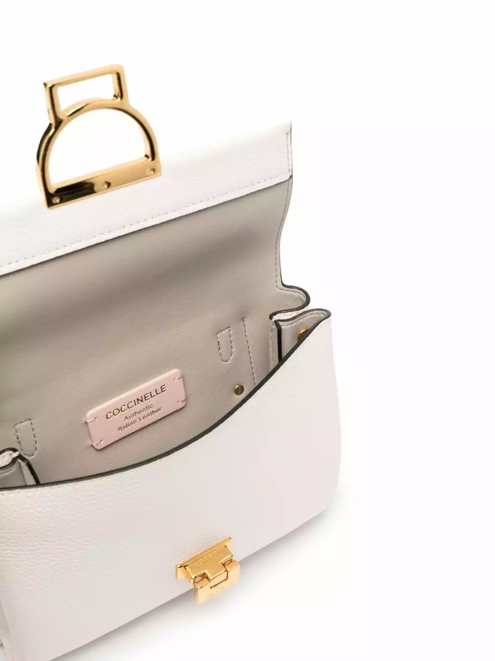 Bianco opaco, pelle di vitello, trama zigrinata e dettagli color oro.