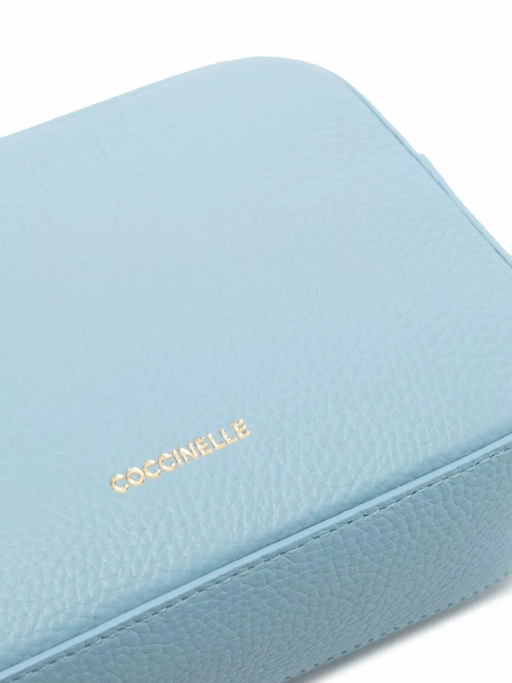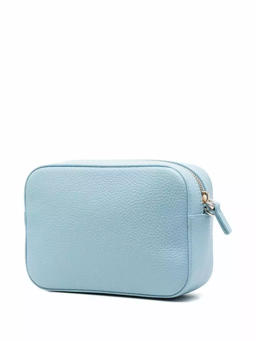 Blu chiaro, pelle di vitello, trama martellata, scritta con logo, tracolla con logo, dettagli color oro, etichetta interna con logo, chiusura superiore con zip, tracolla regolabile e rimovibile e scomparto unico.