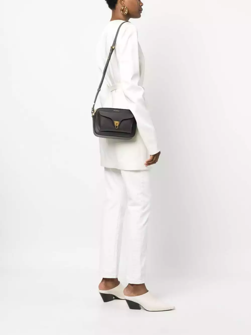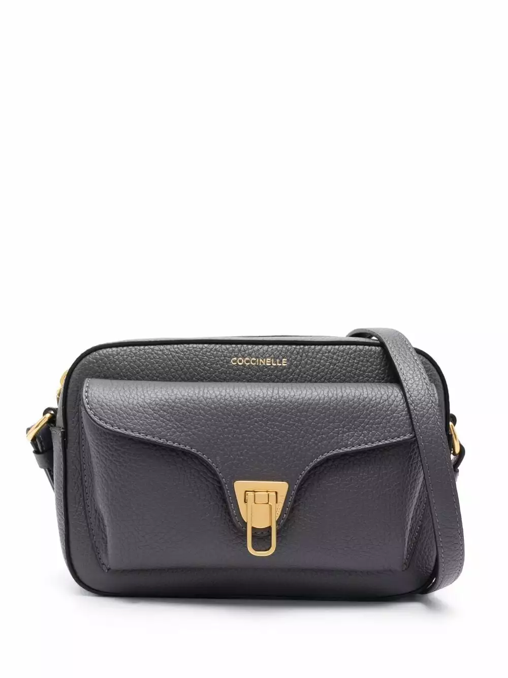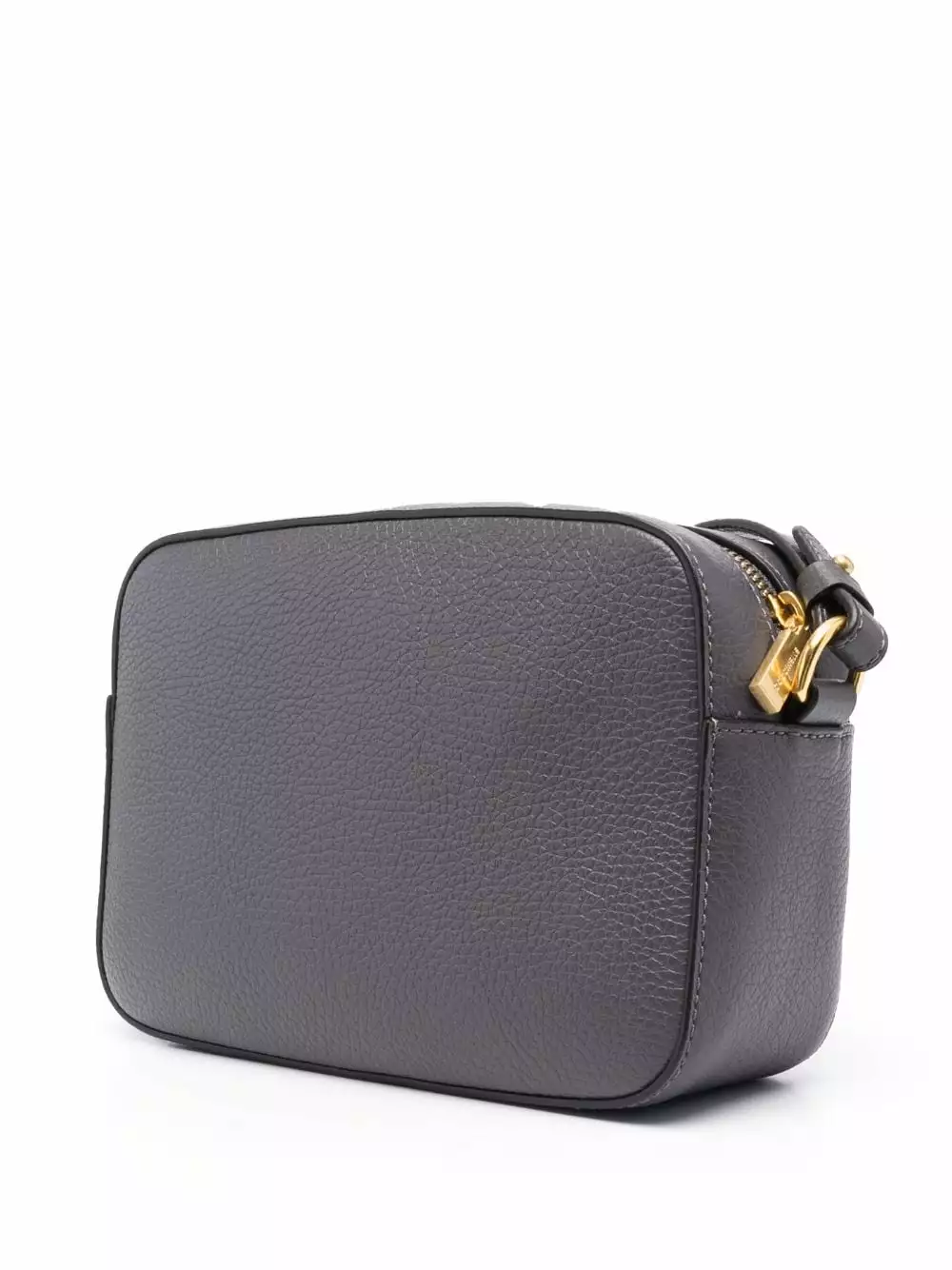 Grigio antracite, pelle di vitello, trama martellata, stampa con logo frontale, dettagli color oro, chiusura superiore con zip, design con fascia singola, tasca frontale con patta, tasca interna con zip e scomparto unico.