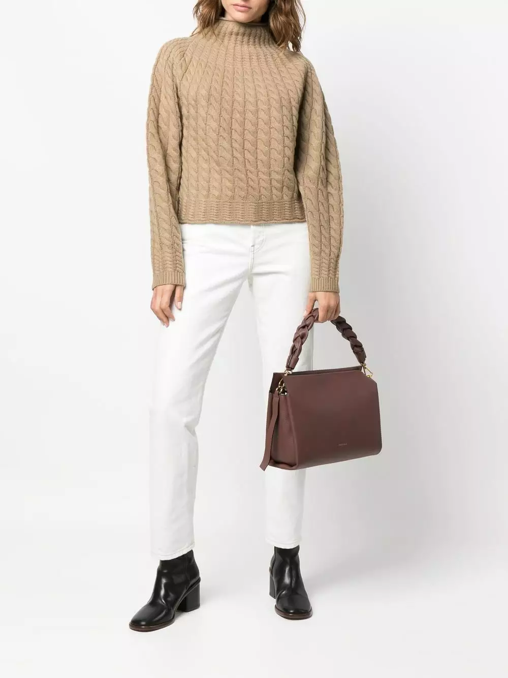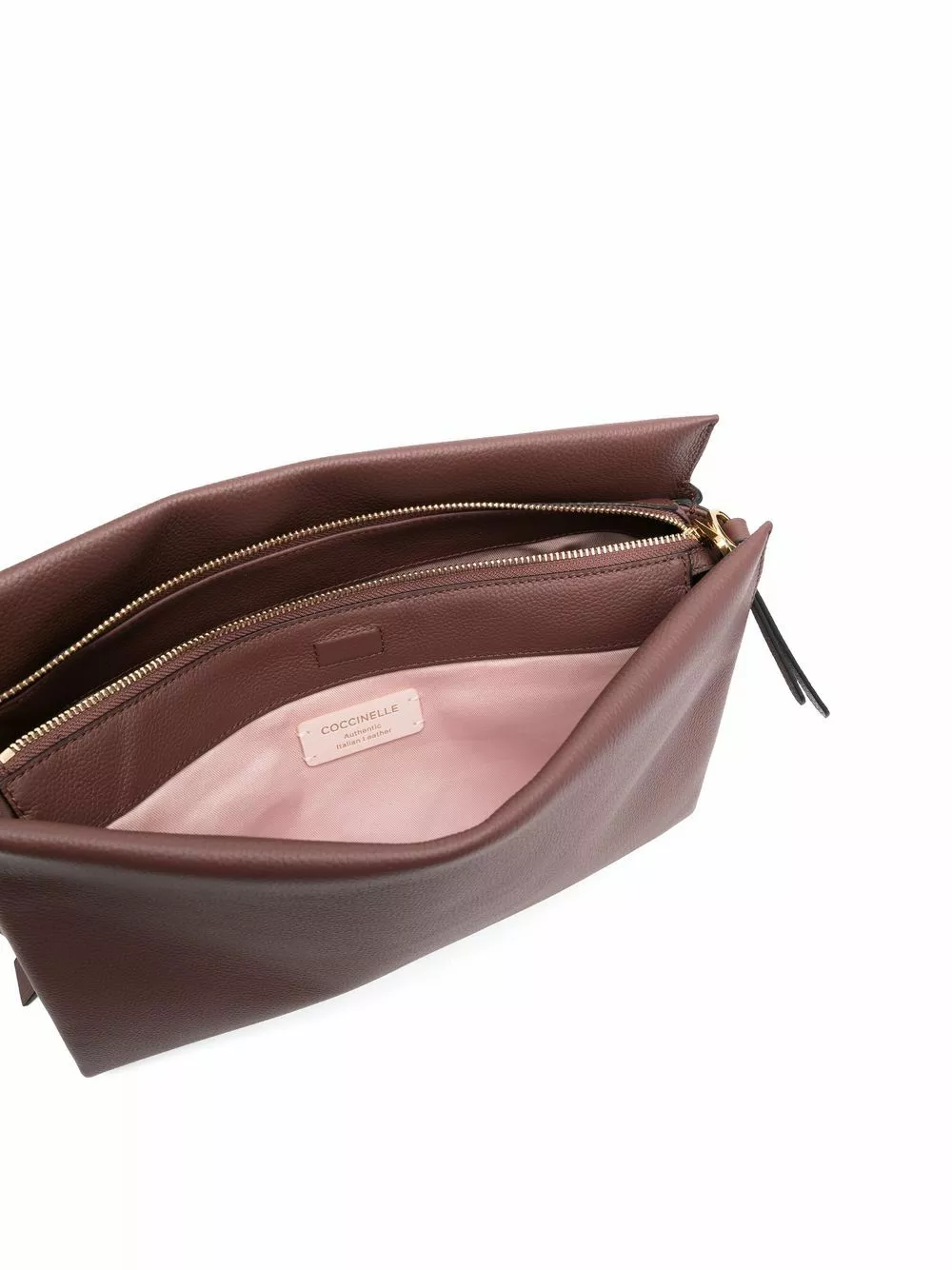 Marrone, pelle di vitello, trama martellata, stampa con logo sul davanti, dettagli color oro, dettaglio intrecciato, chiusura superiore con zip e scomparto unico.