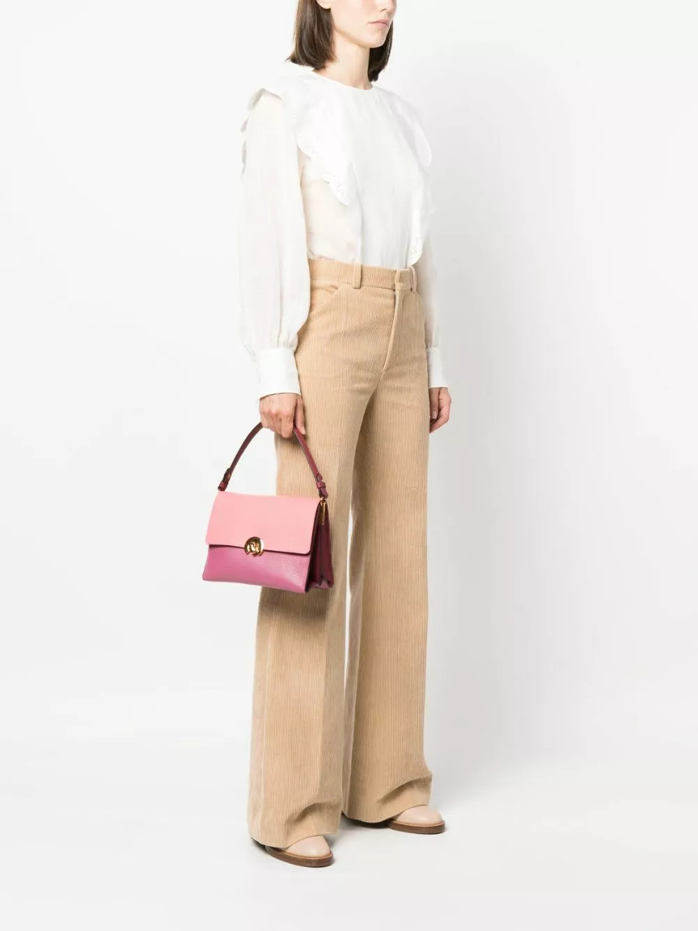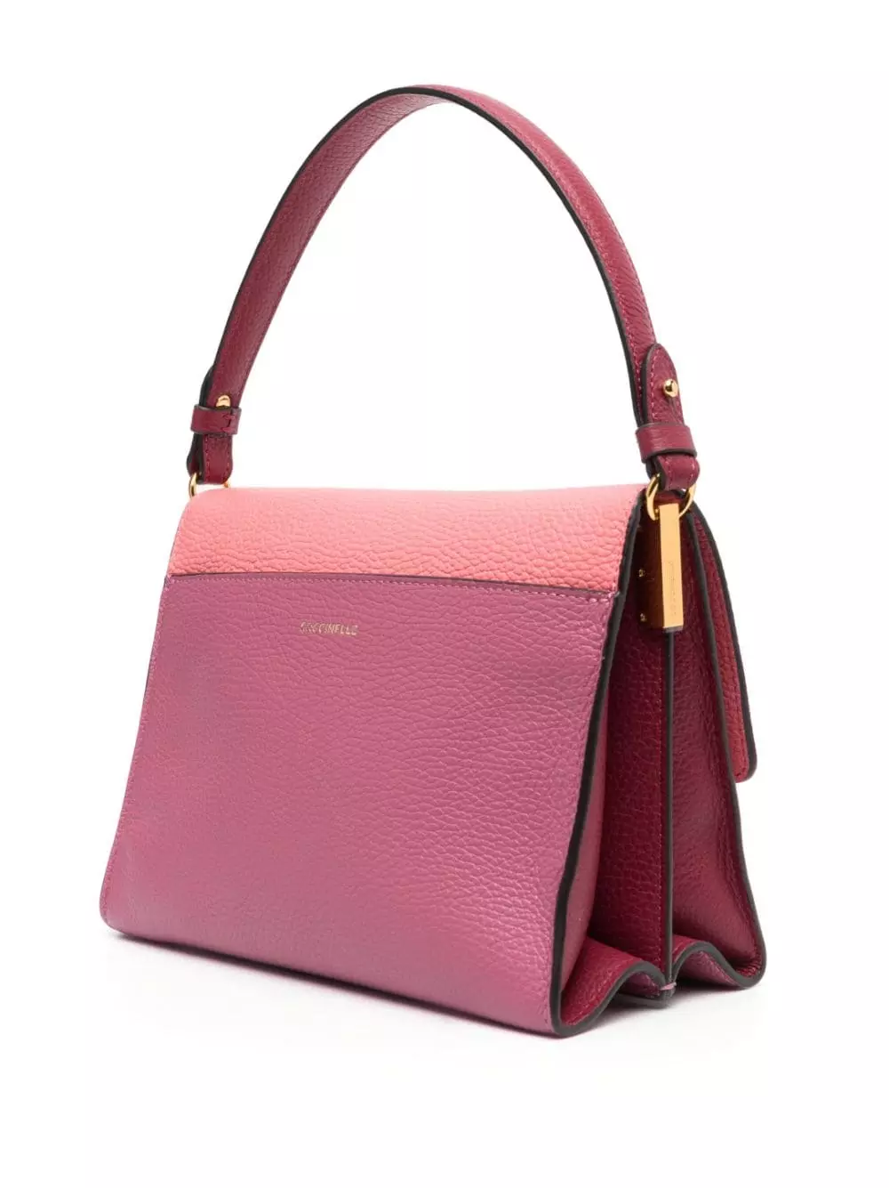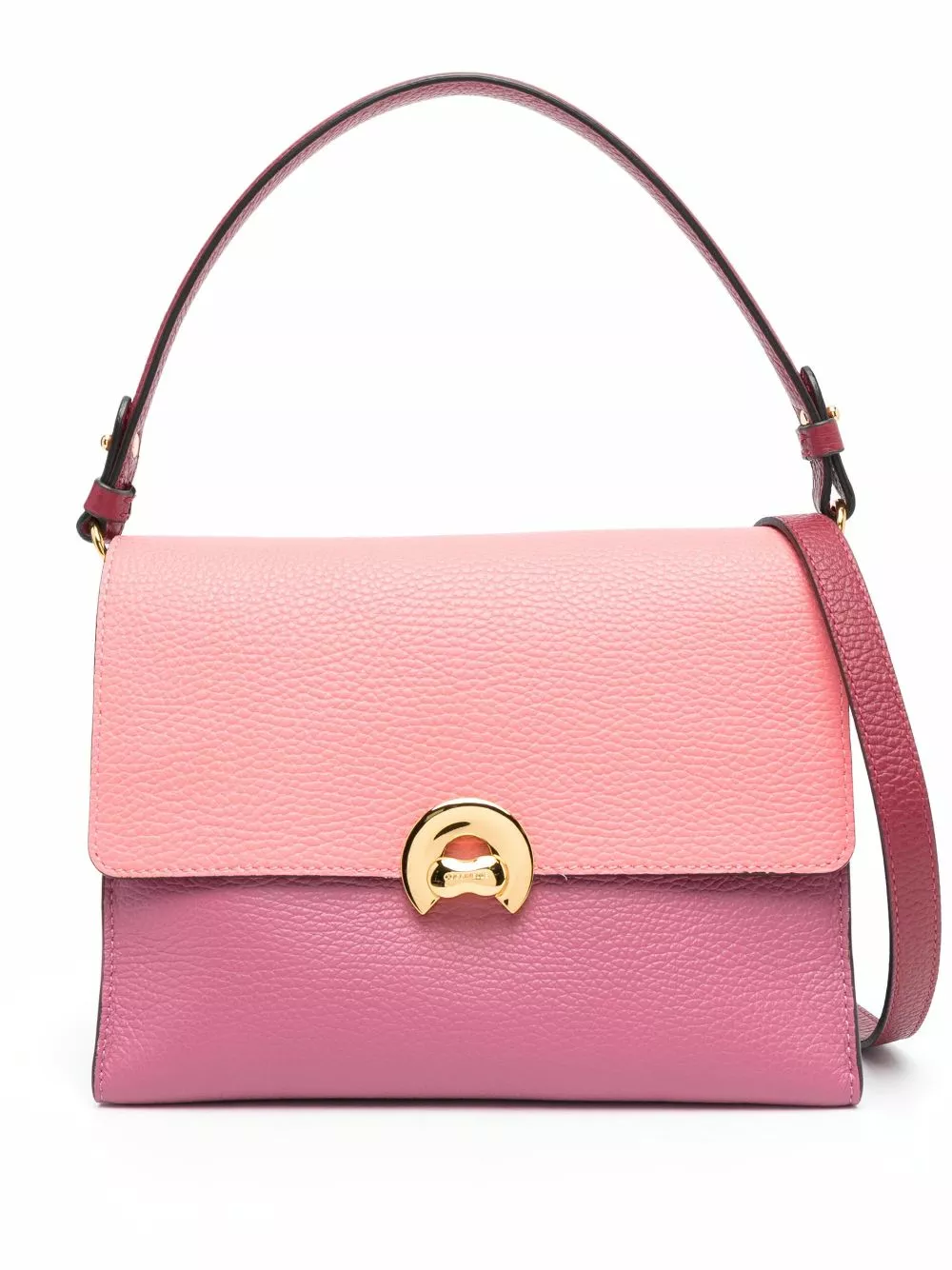 Rosa bubblegum, magenta, pelle di vitello, stampa con logo sul retro, applicazione interna con logo, chiusura con pattina frontale, tracolla rimovibile, manico piatto, tasca interna con zip e scomparto interno diviso.