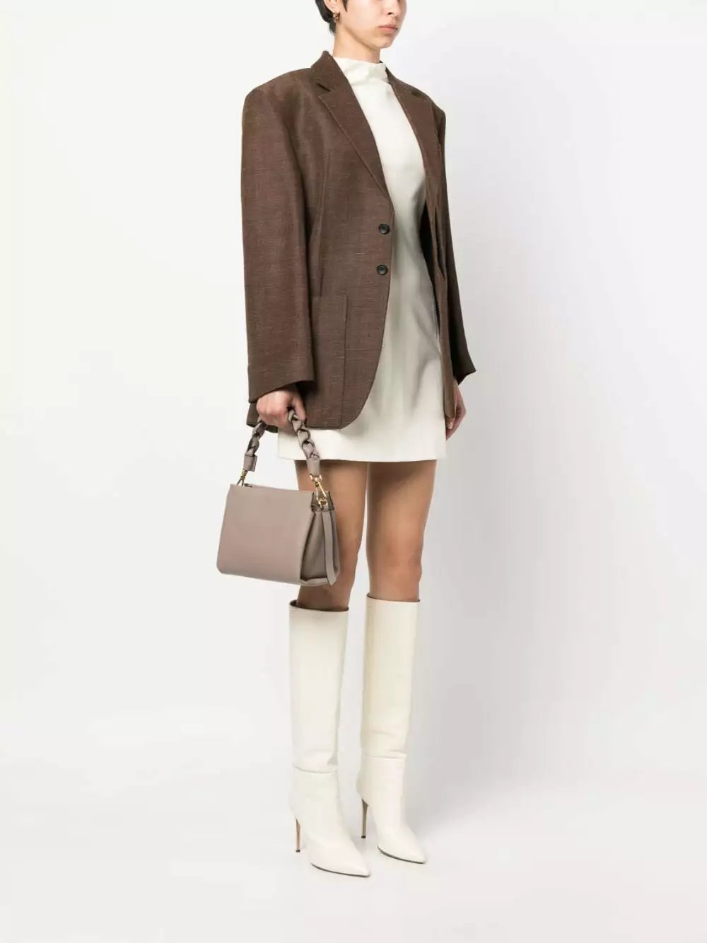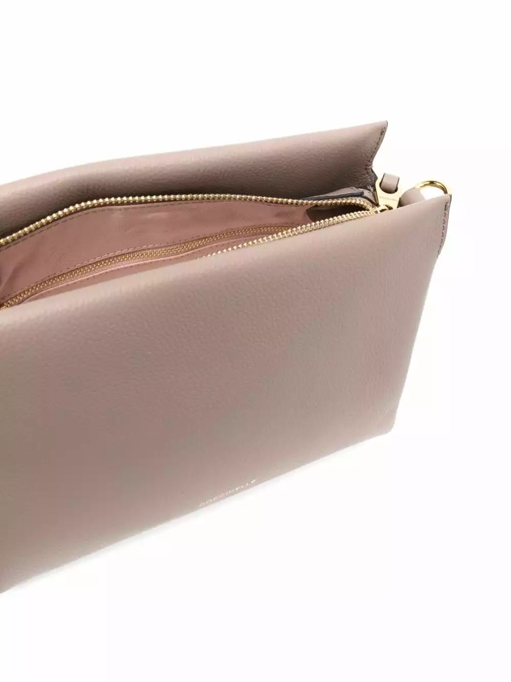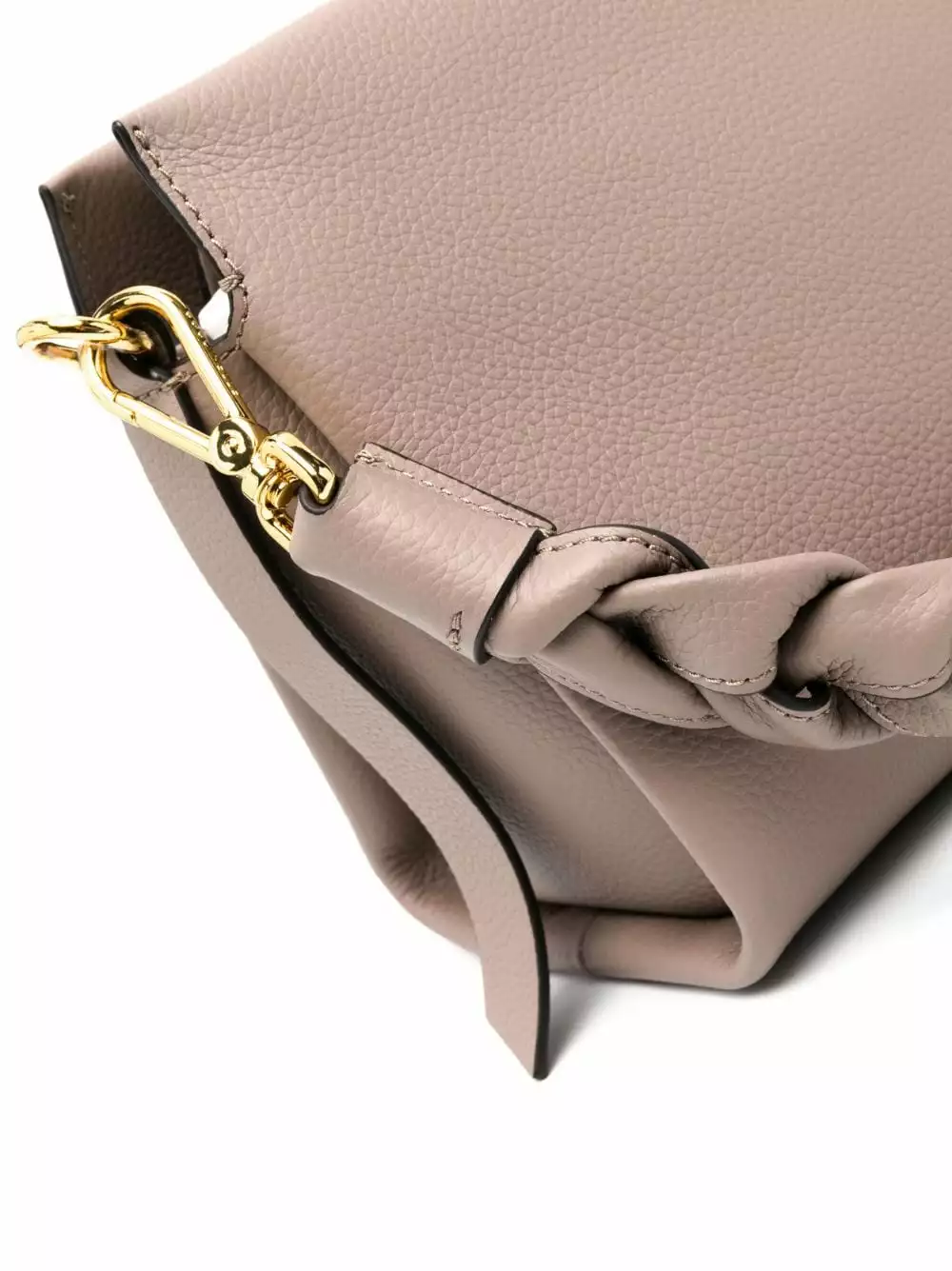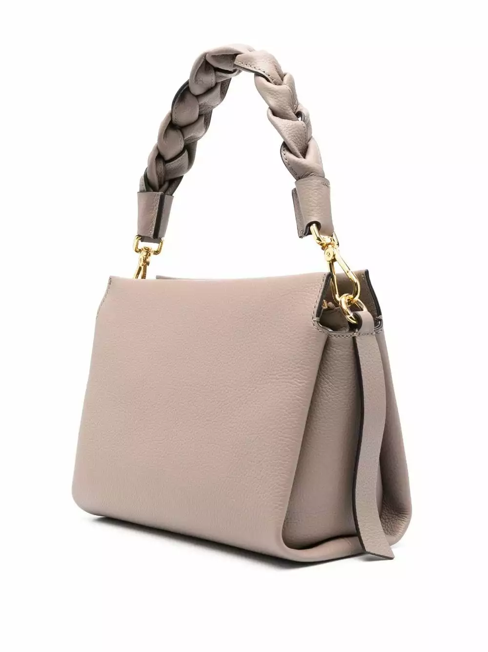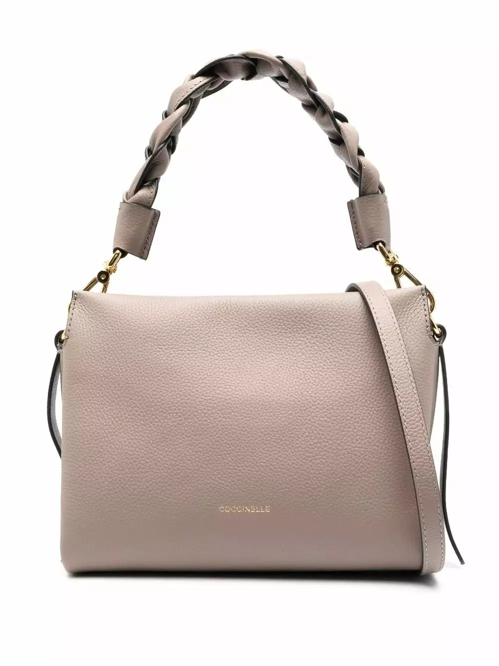 Manico intrecciato, chiusura superiore con zip e tracolla regolabile.
