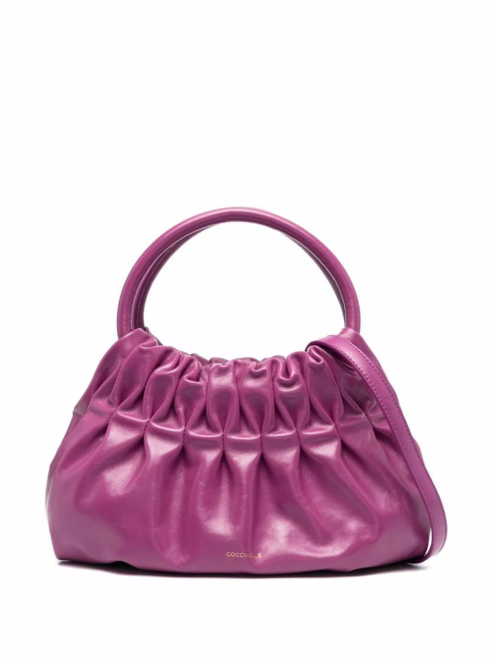 Lilla scuro, pelle di vitello, dettaglio con arricciature, logo inciso, scomparto unico, chiusura magnetica nascosta, due manici tondi e tasca interna con zip.