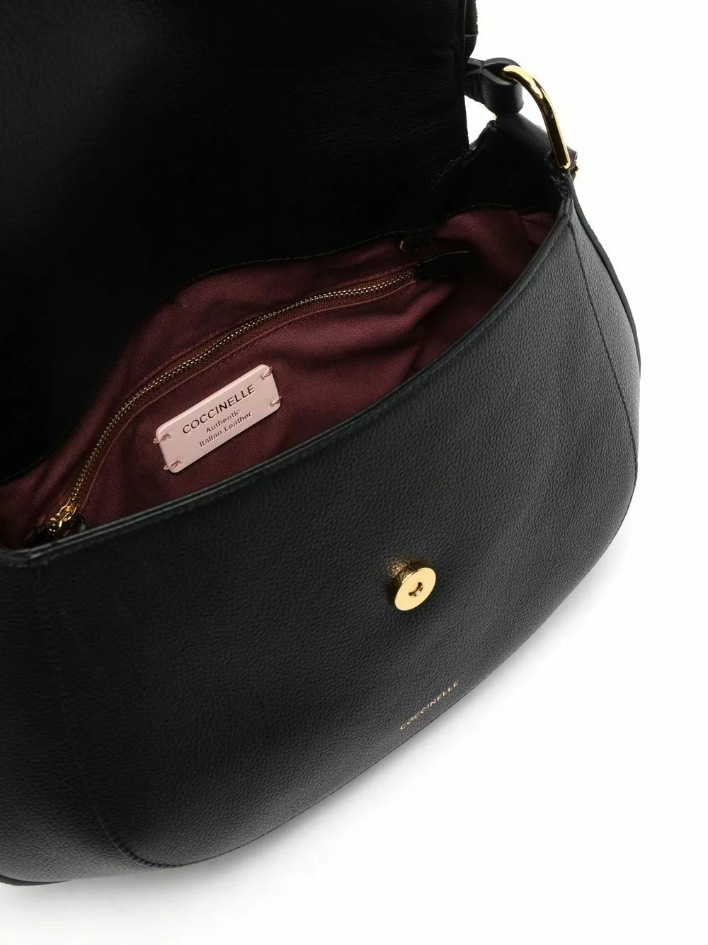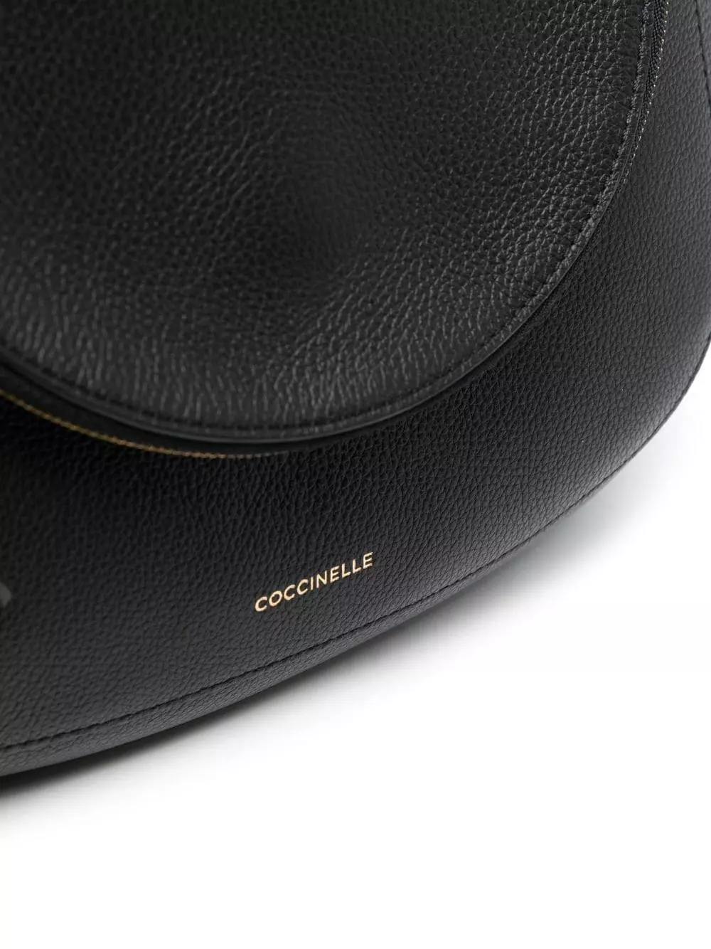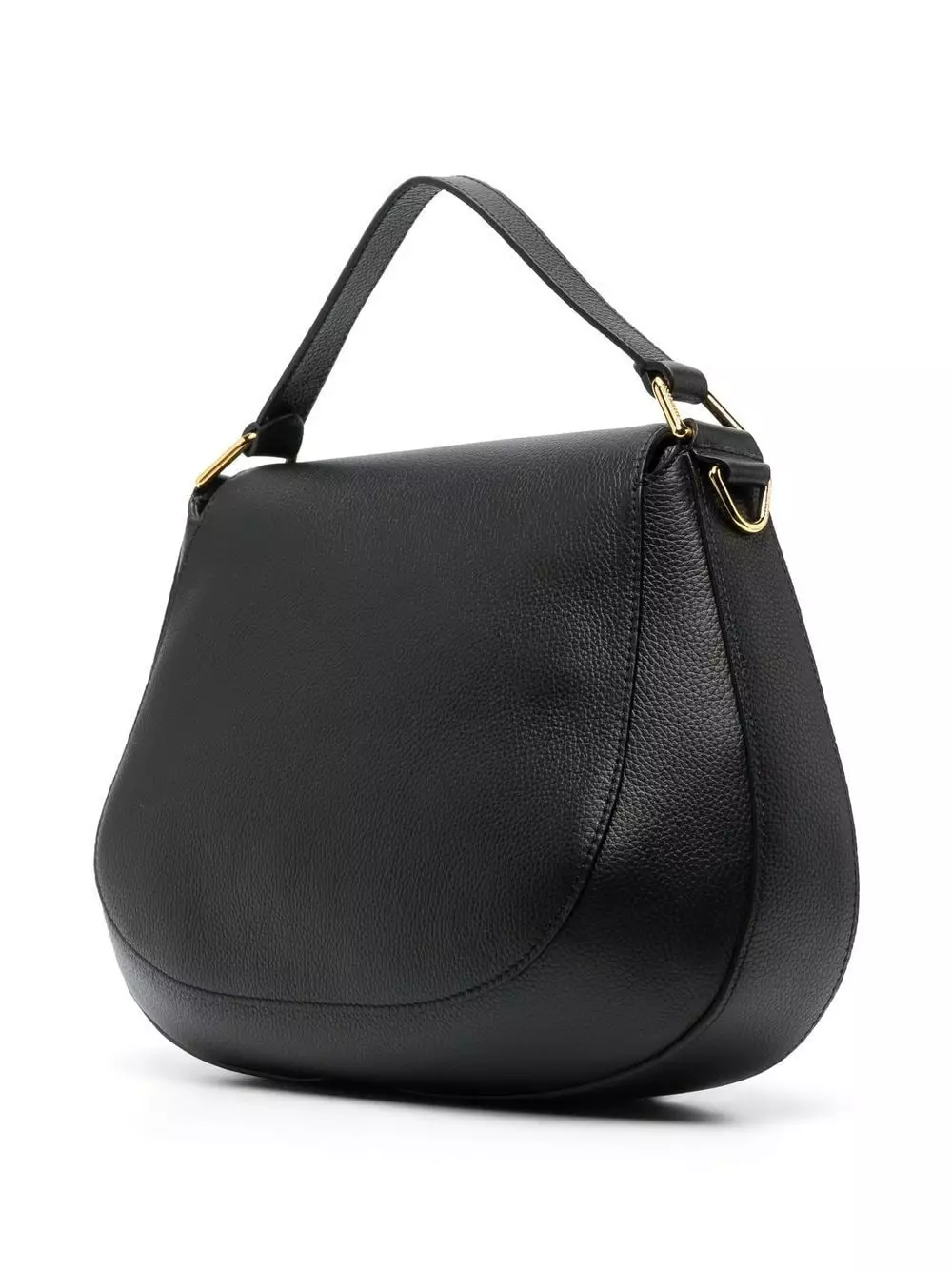 Nero, pelle di vitello, trama zigrinata, dettagli color oro, logo in lettere color oro, applicazione interna con logo, manico piatto, tracolla rimovibile, tasca frontale con zip, battente nella parte superiore con chiusura magnetica, scomparto unico e tasca interna con zip.