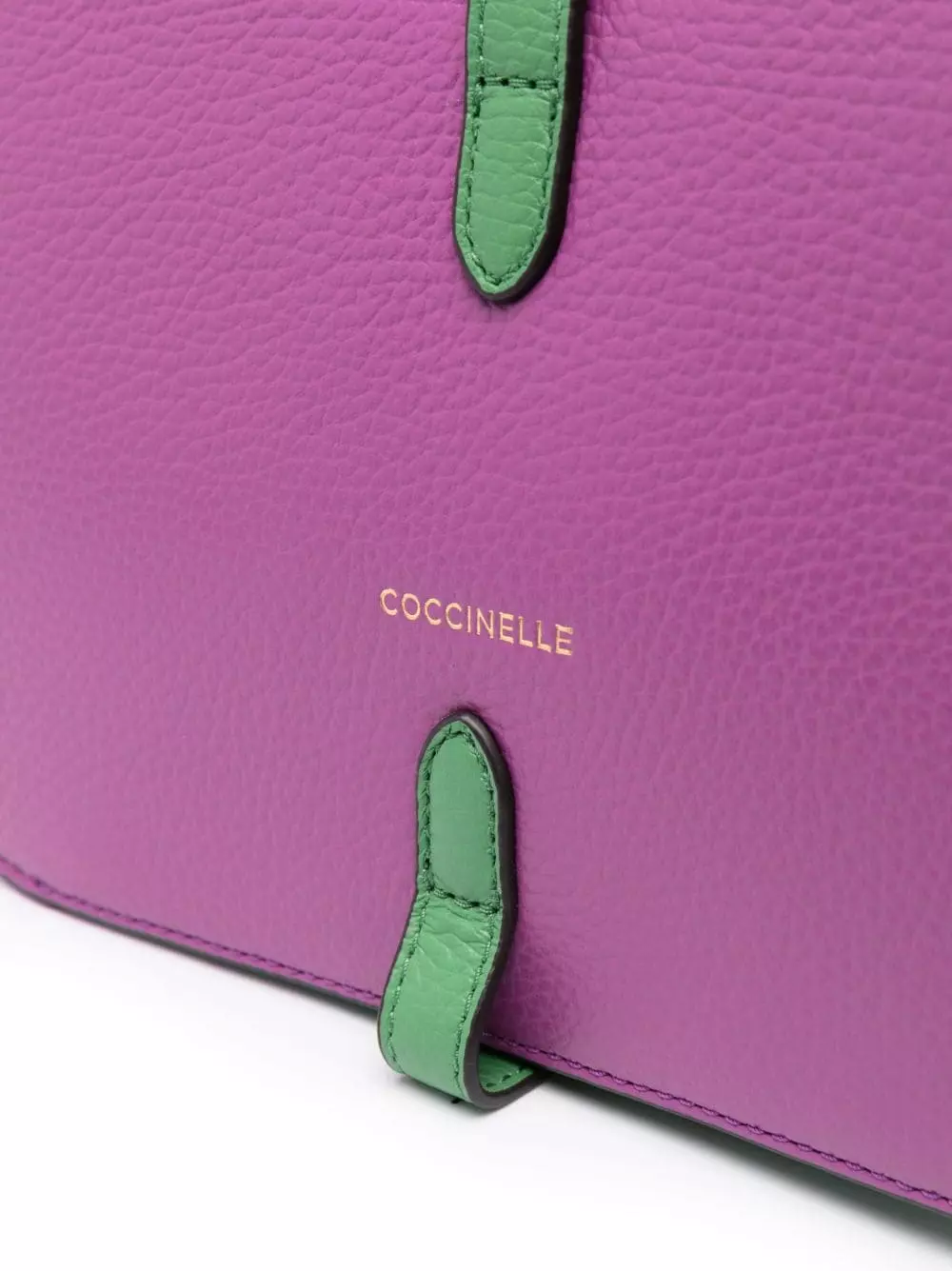 Vinaccia, verde prato, pelle di vitello, trama martellata, dettagli color oro, logo in lettere color oro, manici rotondi, tracolla regolabile e rimovibile, chiusura con fibbia, scomparto unico, tasca interna con zip e portamonete rimovibile.
