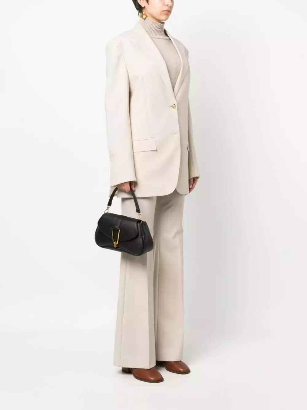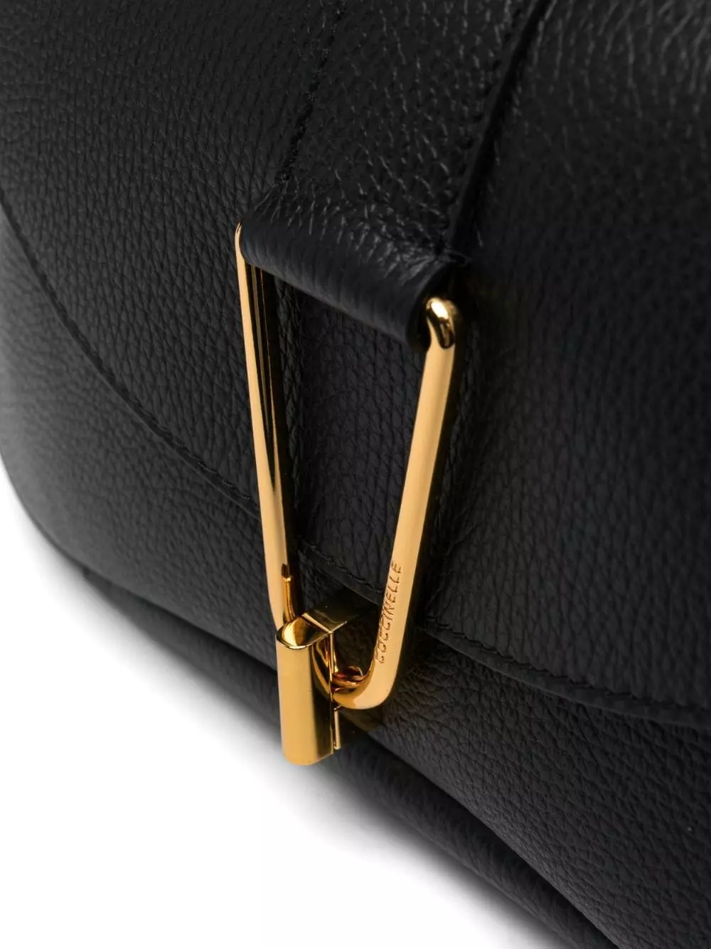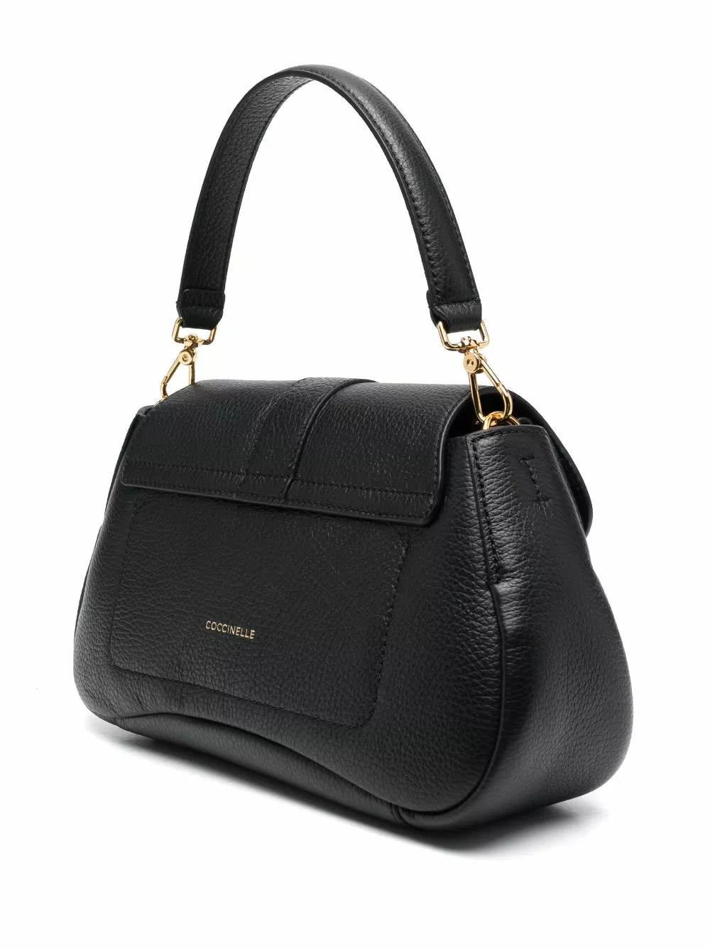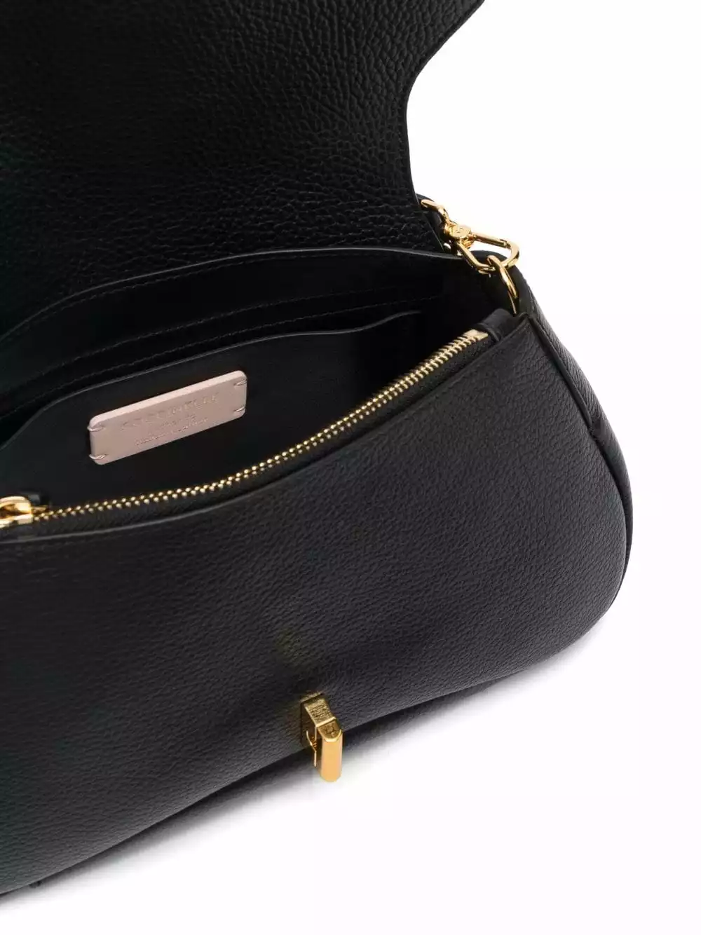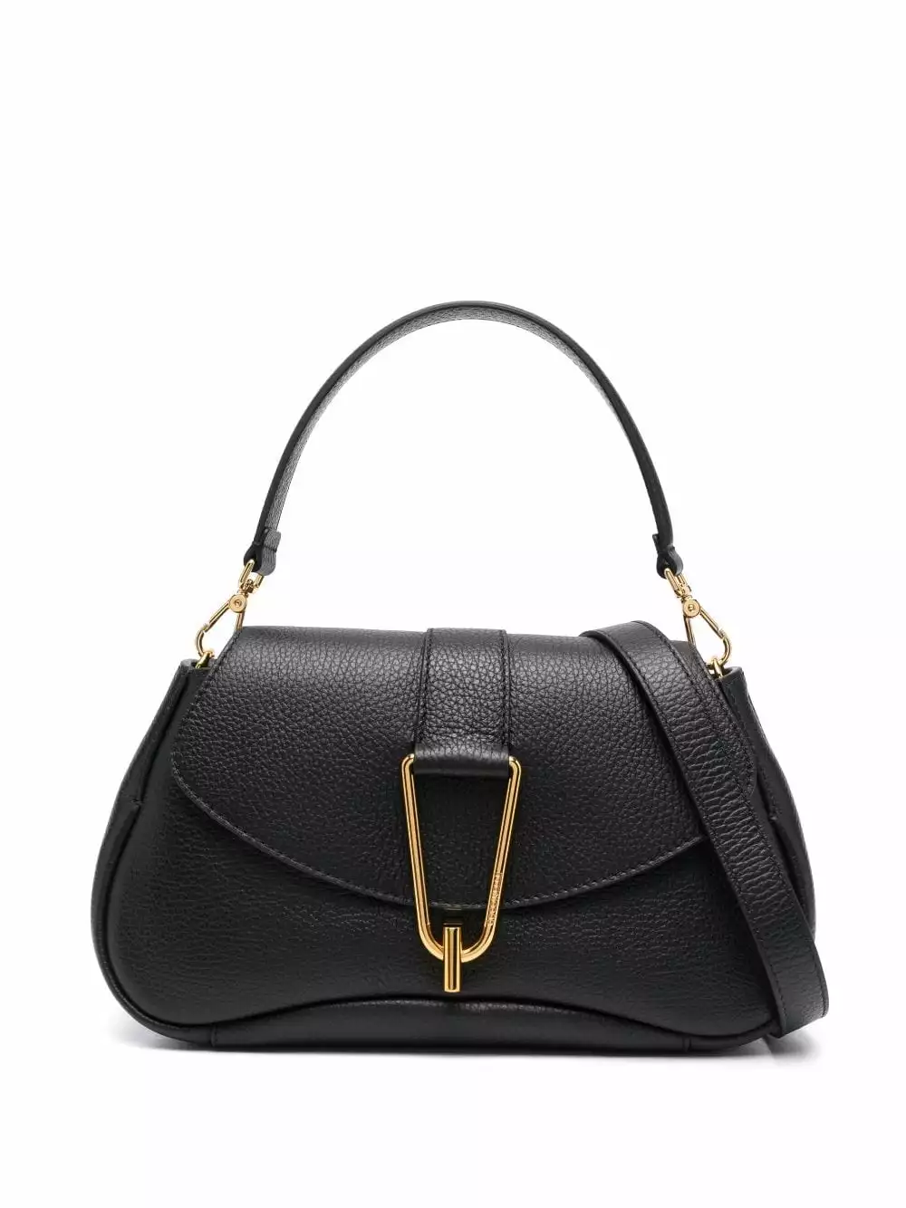 Manico piatto, pattina nella parte superiore, tasca interna con zip e tracolla regolabile.