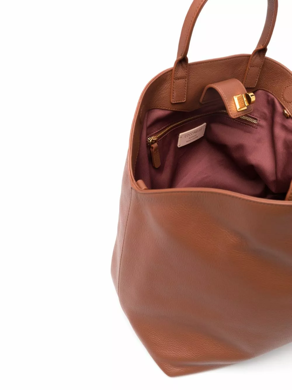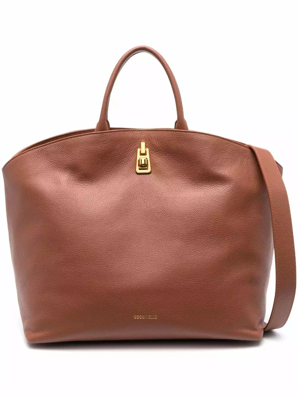 Cioccolato, pelle di vitello, logo in lettere color oro, dettagli color oro, applicazione interna con logo, due manici tondi e scomparto unico.