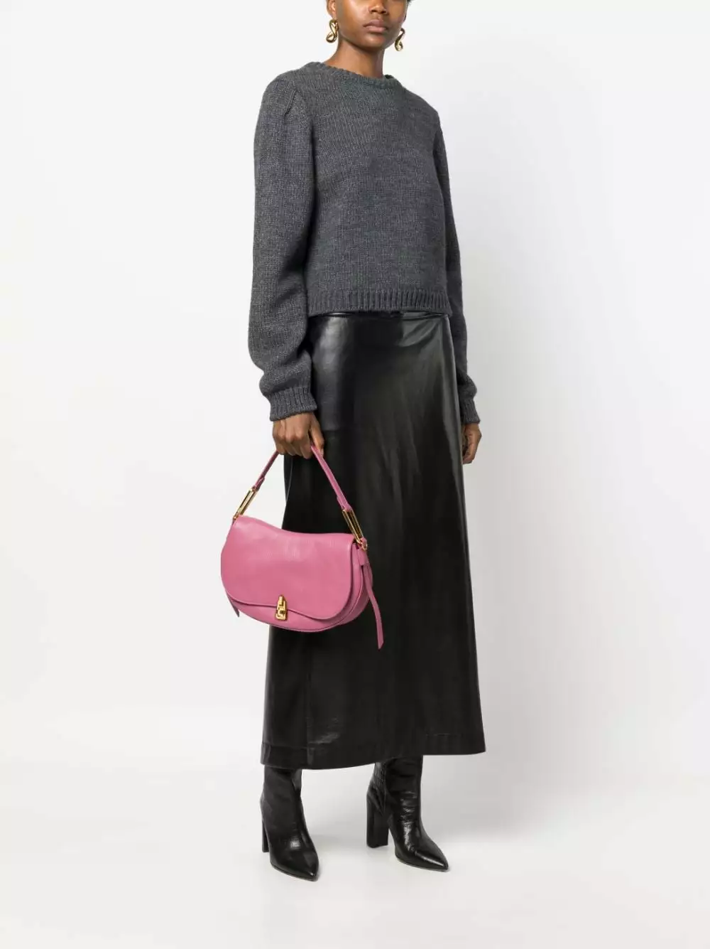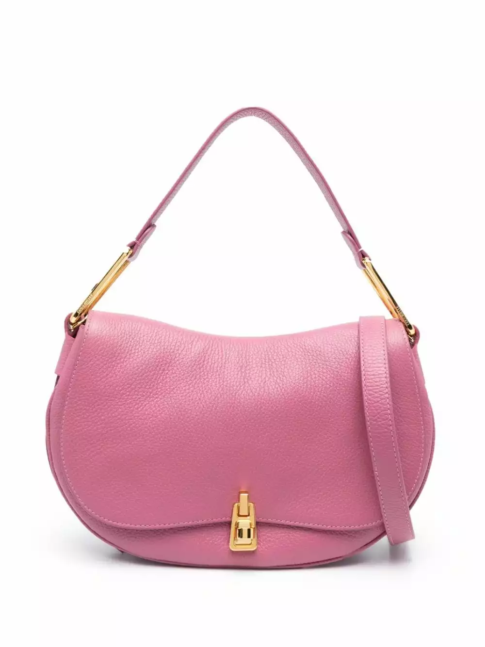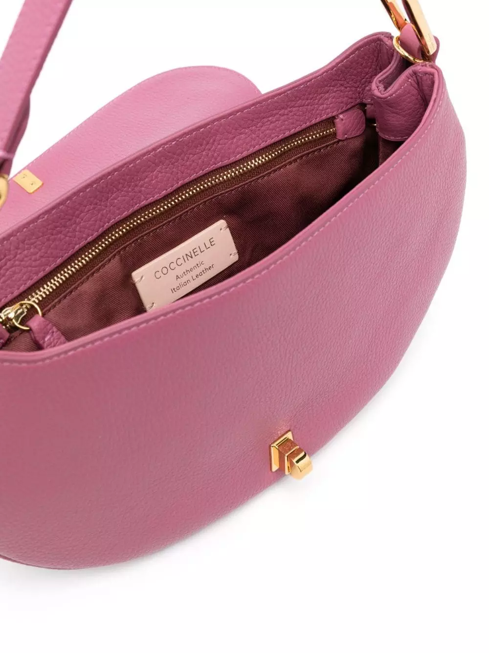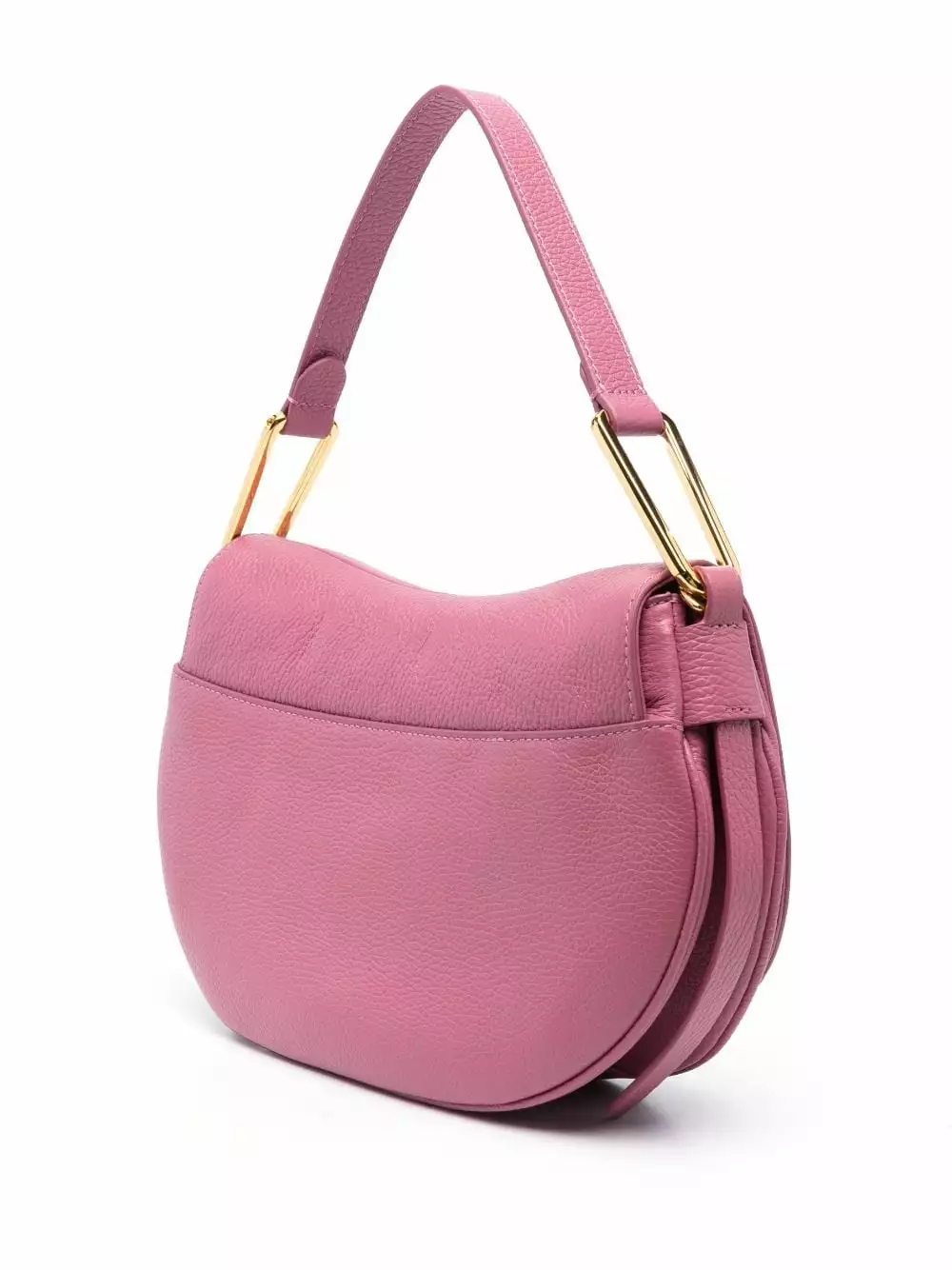 Rosa pastello, pelle di vitello, trama martellata, componenti metalliche color oro con logo inciso, pattina nella parte superiore, manico piatto, tracolla rimovibile, tasca interna con zip e scomparto unico.