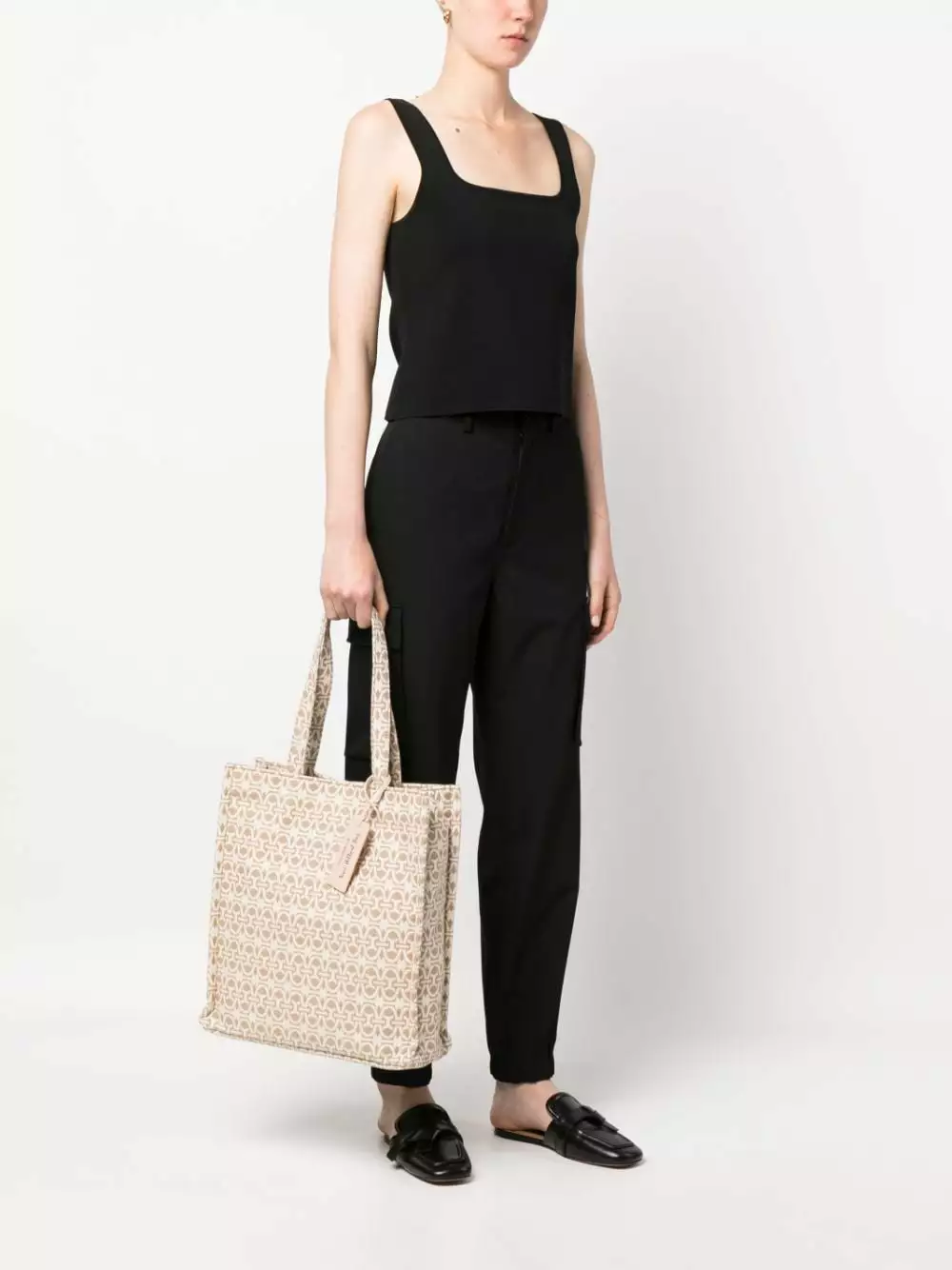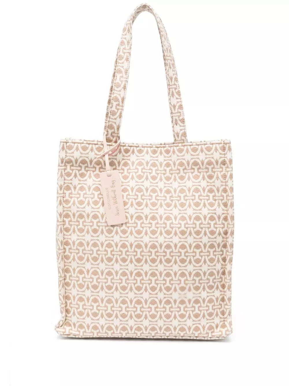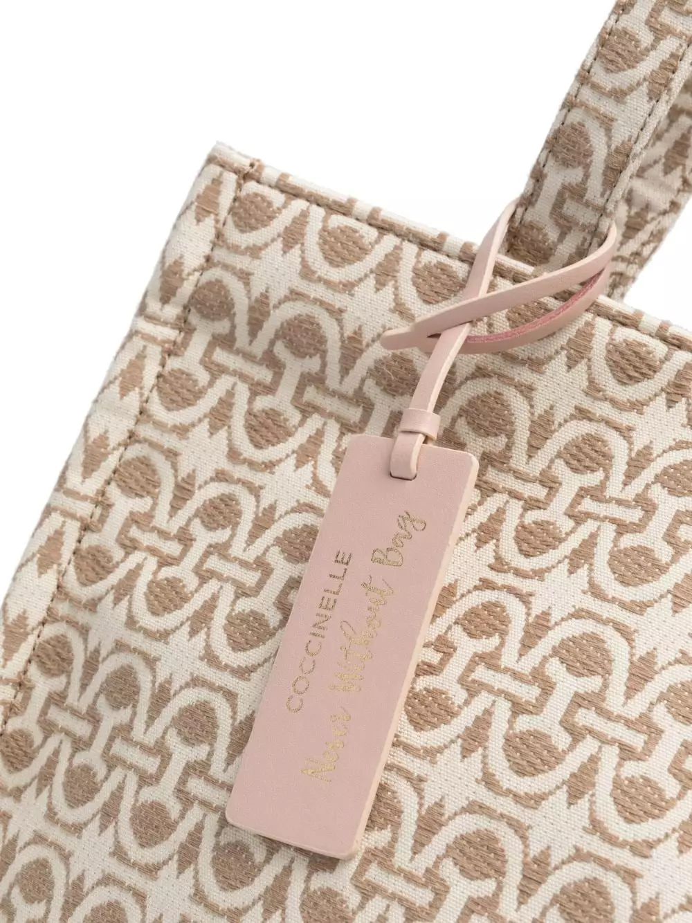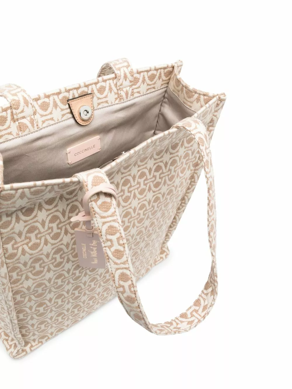 Jacquard con monogramma, targhetta con logo, due manici lunghi, chiusura magnetica, scomparto unico, applicazione interna con logo e design rettangolare.