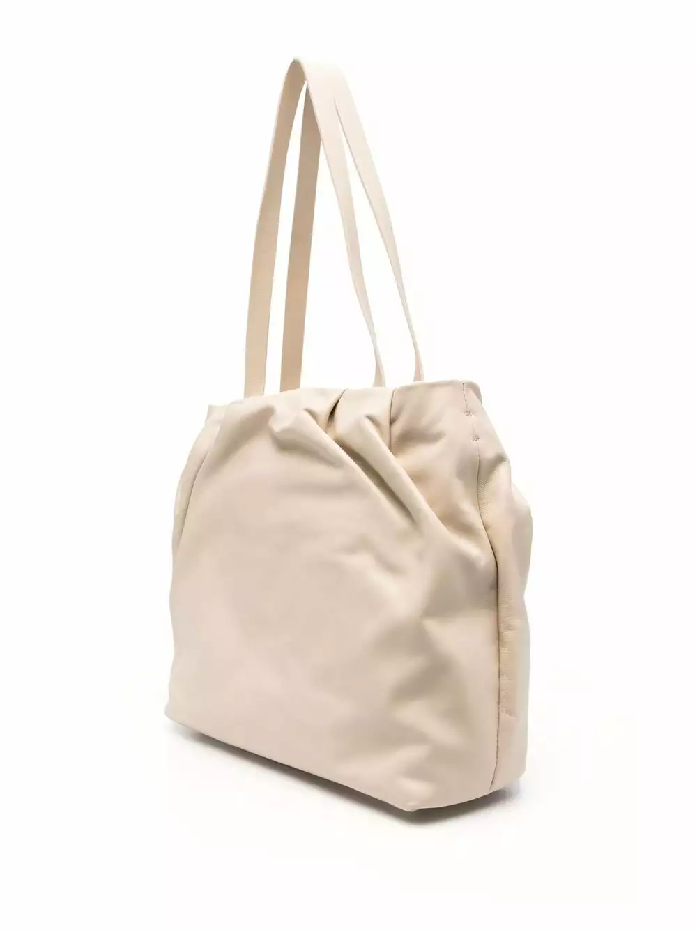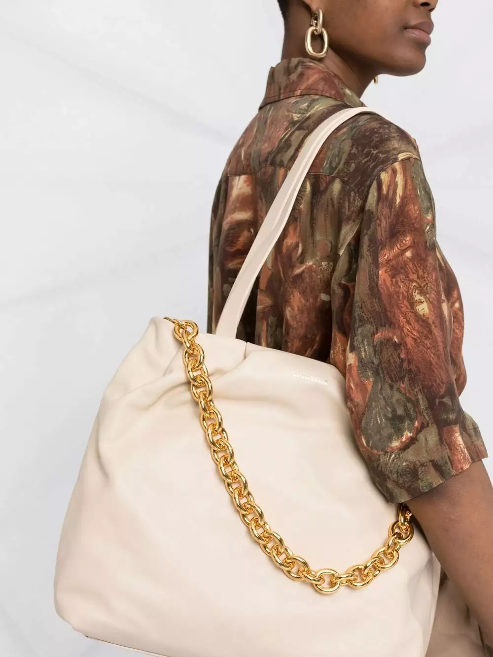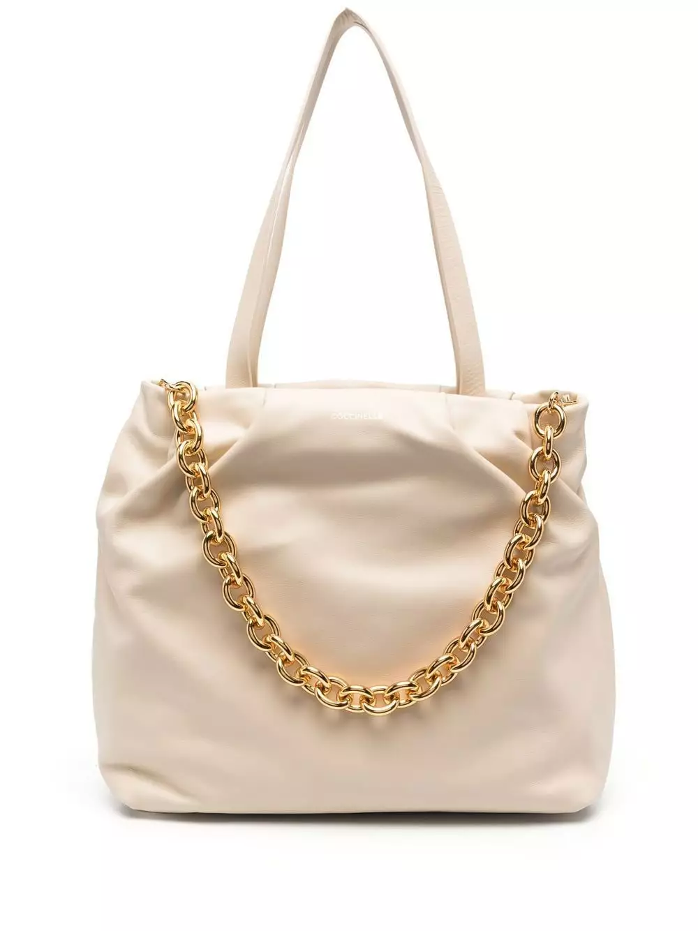 Bianco opaco, cuoio, dettaglio con ruches, dettagli color oro, logo in lettere color oro, due manici tondi, tracolla rimovibile con catena, chiusura superiore con zip, tasca interna con zip e applicazione interna con logo.