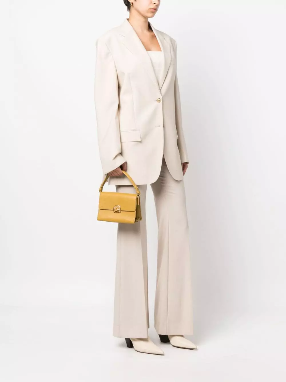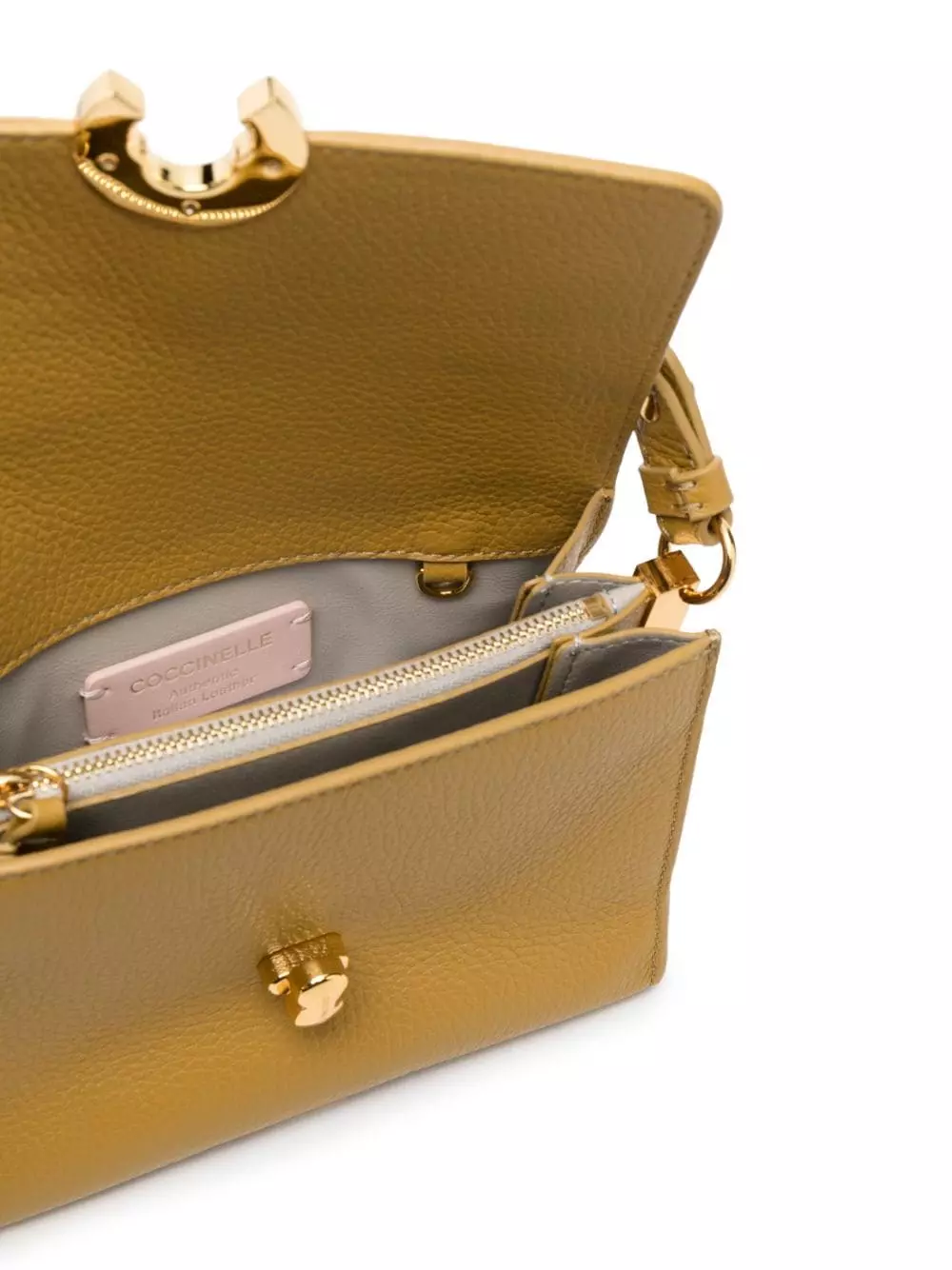 Giallo ocra, pelle di vitello, trama zigrinata, fodera in pelle cruelty-free, gonna plissettata, dettagli color oro, logo in lettere color oro, applicazione interna con logo, pattina nella parte superiore, tasca interna con zip, tracolla regolabile e rimovibile, manico superiore e scomparto interno diviso.