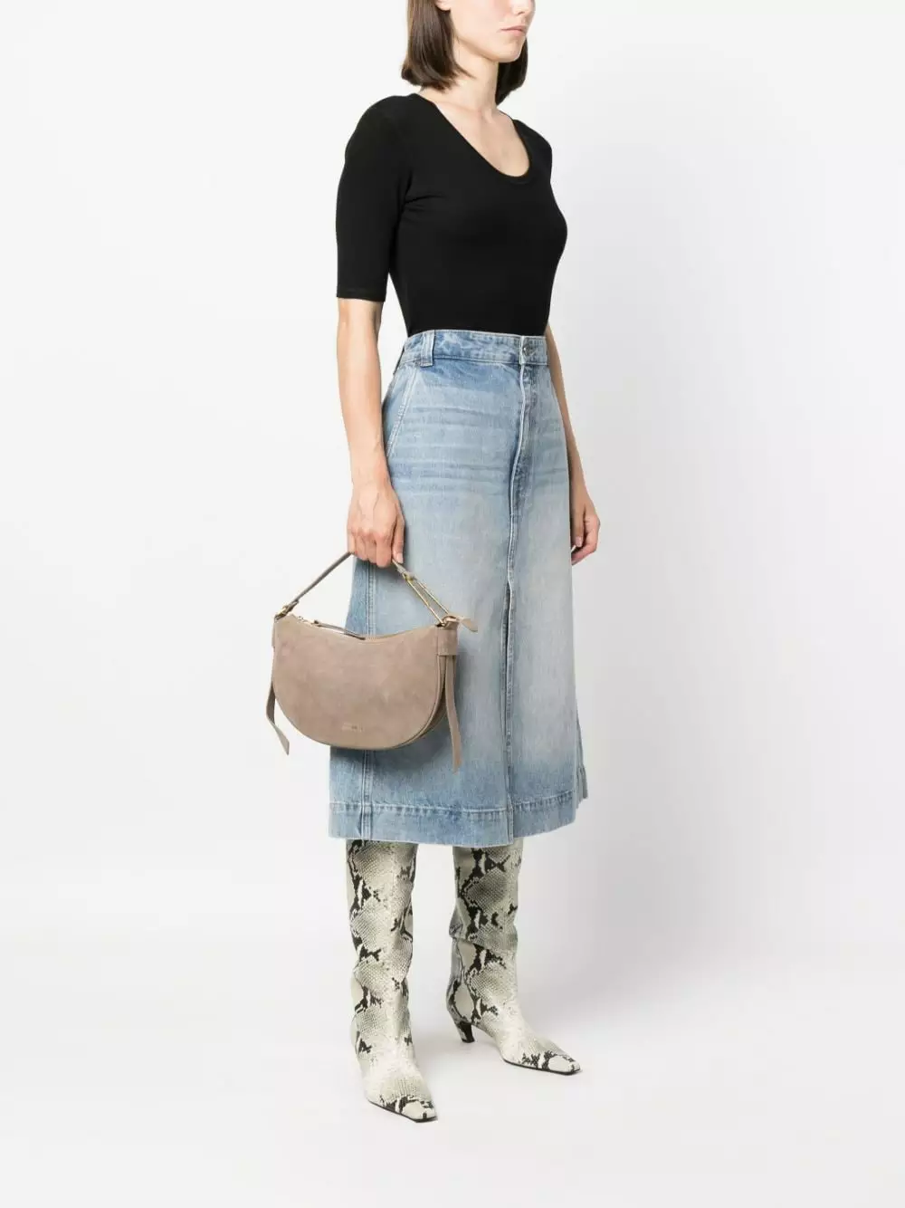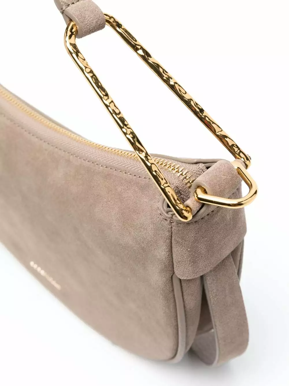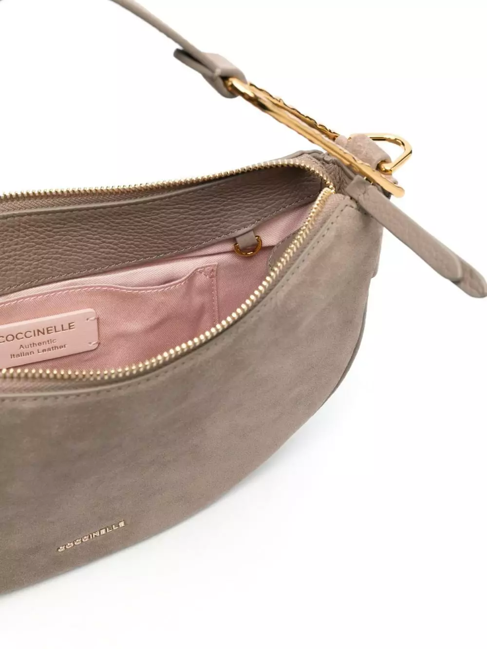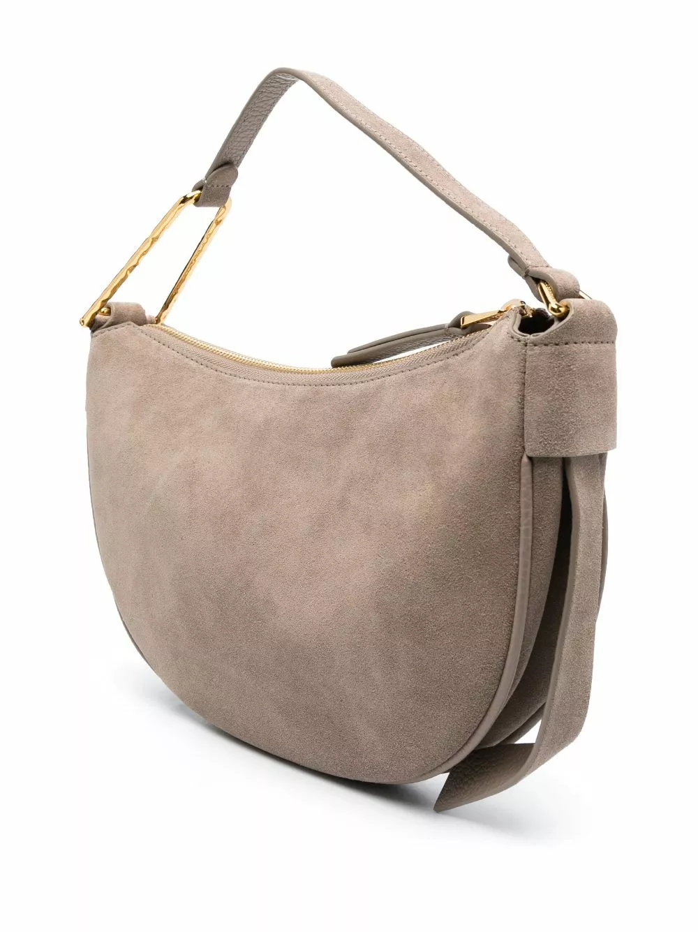 Grigio talpa, pelle di vitello, camoscio, placca con logo color oro, dettagli color oro, manico superiore, tracolla regolabile e rimovibile, chiusura superiore con zip, scomparto unico, applicazione interna con logo e tasca interna a soffietto.